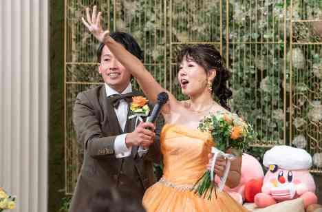 披露宴では、ゲスト全員に立っていただき、新郎新婦とのじゃんけん大会を開催しました! あいこも負けというドキドキのルールの中、勝ち抜いた3名が豪華景品をゲット♡ トラベルギフトやカニ、三田和牛など魅力たっぷりの内容に、会場は大盛り上がり! 歓声と笑い声が広がり、ゲスト全員で楽しめる一体感あふれる時間となりました✧˖°