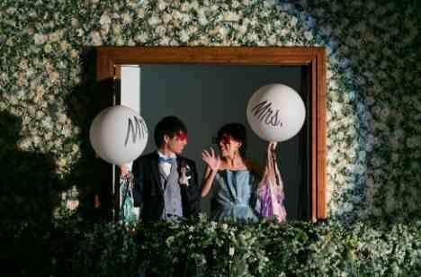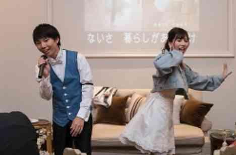 ロックフェスのグラスをかけてお色直ししたふたりが、バルーンを持って再入場。そのまま各テーブルを回るフォトラウンドを行い、撮影や交流を満喫した。新郎からのサプライズ映像は「結婚してくれてありがとう」の気持ちをこめて、歌の予告をする内容。「目の前で彼が歌ってくれて、感動の涙が広がるシーンになりました」