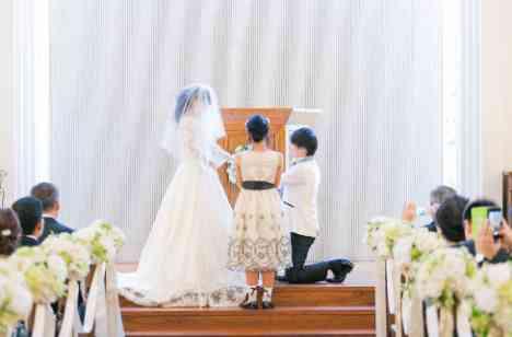 新婦の恩師の娘がリングガールをつとめ、憧れのエンゲージカバーセレモニーやメッセージ入りの木のパーツの結婚証明書、クロージングキスなど、ふたりの想いを反映した挙式に。「司会者さんのお話もすごく良く、感動の声をたくさんいただきました」