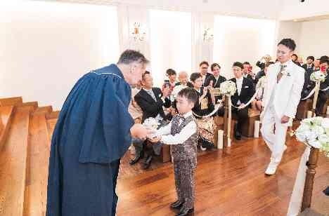 ご新婦様の甥っ子様にリングボーイを務めて頂き、ご新郎様の入場と共に先頭を歩いてもらいました♪厳かな雰囲気の中にも心温まるシーンもあり、皆様で作り出すとてもアットホームな式となりました。甥っ子様に頑張って頂き、お二人も少し緊張がほぐれたご様子でした♡