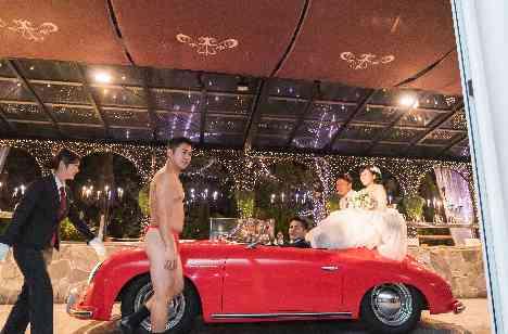 ゲストに楽しんでもらいたいという中に、入場シーンを変わった形で行いたいというご希望から、当館オリジナルのオープンカーをご利用いただきました。大切なご友人様にもご協力を頂き、披露宴スタートから大変盛り上がっておりました!!