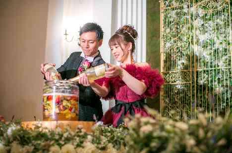 披露宴のコンセプトを叶えるために、当館オリジナルのシェフズダイニングで出来立てアツアツのお食事をお楽しみいただきながら、ゲストと触れ合える楽しい雰囲気に!また再入場の際にはフルーツコンポートの演出でゲストへ素敵なおもてなし!