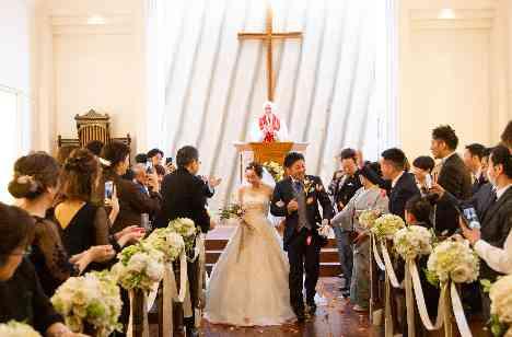 新婦様がお選びになったレースのほどこされたドレスを着てご自身でご準備をなさったドライフラワーのブーケを持ってのご入場。白のドレスがとても映える木目基調のバージンロードでドレスの細部までゲストの方々にご覧いただきました。