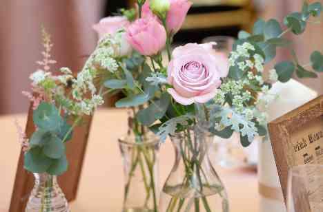 新郎新婦様の掛け合いがとても可愛らしく微笑ましいおふたり。ゲストの方々に結婚式を楽しんでもらいたい!と楽しい演出や会場コーディネートについて何度もお打合せを重ねながら進めさせていただきました。会場内にお花を感じられるように小さな器を会場全体にあしらい、【淡いピンク×ナチュラルグリーン】のお色味で華やかにコーディネートいたしました。