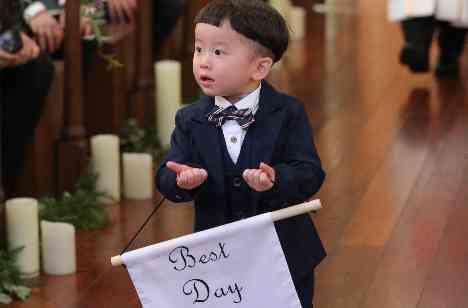 親族のお子様にフラッグボーイのお手伝いをしていただきました。とても可愛く頑張って運ぶ姿にゲストもほっこり。新郎新婦様も少し緊張されているご様子でしたが、ゲスト様からのたくさんの祝福で笑顔に包まれました。