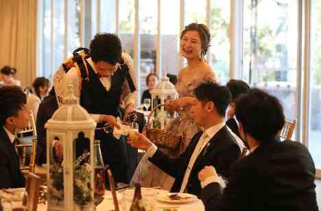 酒がお好きのゲストが多いというお話をお伺いしプランナーよりビールサーバーの演出を提案させていただきました。新郎様はビールサーバーを、新婦様はおつまみをゲストへ配りおもてなしをいたしました。皆様にはたくさん召し上がっていただき、また、ゲストから新郎様へ注ぐシーンなどもありとても盛り上がりました。