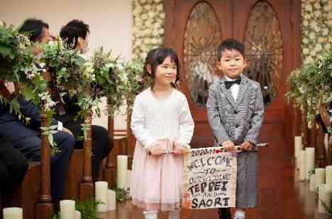 おふたりの甥っ子、姪っ子さんにお手伝いをしていただき、終始和やかな雰囲気に包まれた挙式となりました。フラワーガールやリングボーイはもちろんのこと、フラッグボーイのお手伝いもしていただきました。一生懸命なお子様たちのお姿に、新郎新婦だけではなくゲストの皆様も笑顔が溢れる素敵な挙式をお過ごしいただきました。