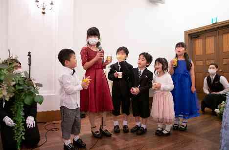 お子様たち全員に披露宴の合図をしてほしいということで、甥っ子・姪っ子さん全員に乾杯のご発声をいただきました。再入場ではテーブルラウンドとして光の演出を取り入れていただき、ゲスト全員で作りあげるという思いを込めて各テーブルへ花びらをおふたりが配り、司会者の合図とともに全員一斉に花びらをグラスに入れて光らせるとう参加型の演出も行い、大変盛り上がる披露宴となりました。