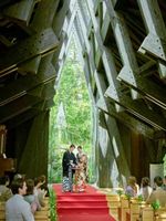 木のぬくもりを感じる教会にて、和装人前式を執り行うことができるのは迎賓館の特徴のひとつ。 自然の中での挙式だからこそ、宗教色など無く、おふたりの衣裳やこだわりを感じる挙式が叶う。 和装では、水合わせの儀や紅差しの儀も人気演出のひとつ。