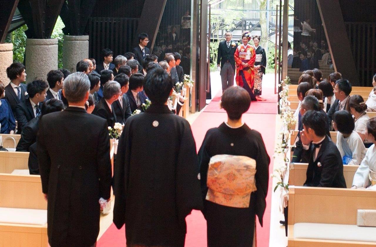 和装を取り入れたいという当初からのご希望から、和装人前式をお選びいただき、 一番感謝を伝えたいご両家親御様と、それぞれご入場いただくようご提案し、親御様にもお喜びいただけました。 立会人代表は、おふたりの親友の方々にお願いをし、おふたりへサプライズの内容での誓いの言葉をお読みいただきました。
