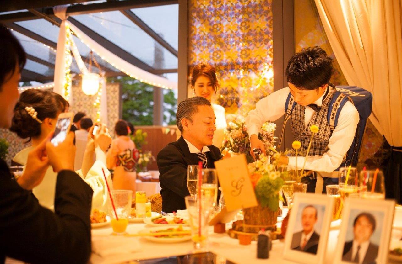 ゲストとたくさんお話が出来るパーティをご希望されたおふたり。ゲストだけでなくご親族様との距離も近く、自由に動けるようブッフェスタイルをご提案。 ピザ釜で焼いたあつあつのピザや、職人が握るお寿司なども用意した、ゲストが喜ぶお料理でおもてなしをしました。 おふたりへのサプライズで、立会人と担当コーディネーターからご両家お母様へお願いをし、新郎新婦様へのお手紙をお読みいただくシーンをつくりました。