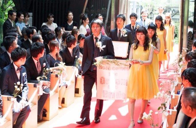 挙式では、それぞれのご友人にブライズメイド&アッシャーをお願いし、入場や退場のエスコートを。華やかなシーンが盛り沢山でした。 挙式後には、会場内ガーデンでブロッコリートスやブーケトスを行い大盛り上がりでした。
