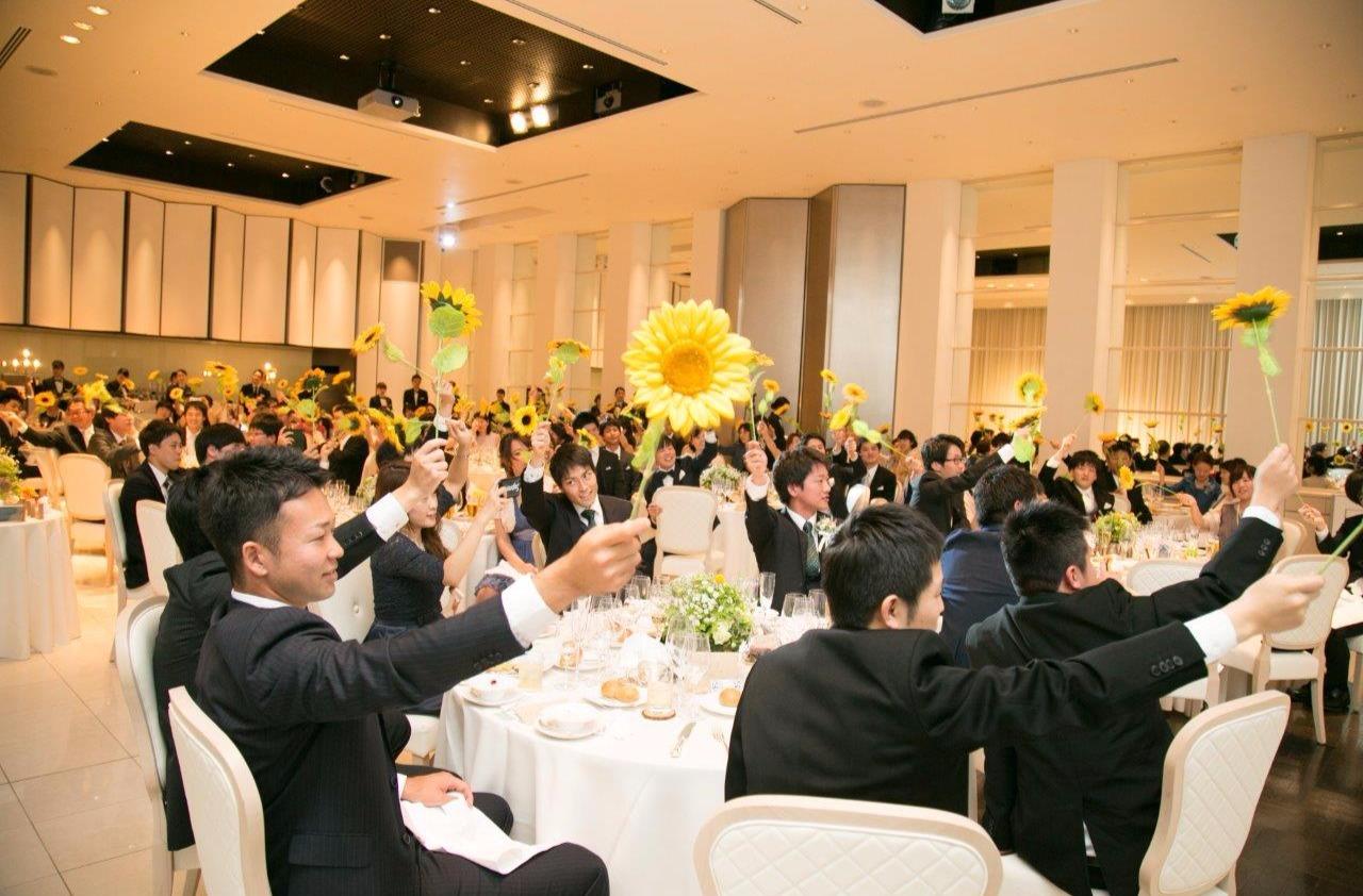 一部のパーティでは、ご友人の余興に新郎がサプライズ登場!プロポーズの際にも渡されたという想い出のひまわりをゲスト全員に配り、みんなに盛り上げてもらいながら新婦に歌のプレゼント♪二部では、新郎新婦がブライズメイドやアッシャーとオープニングダンスをしたり全員参加の脱出ゲームをするなど、ゲストに楽しんでほしいというおふたりの想いが詰まったパーティとなりました。
