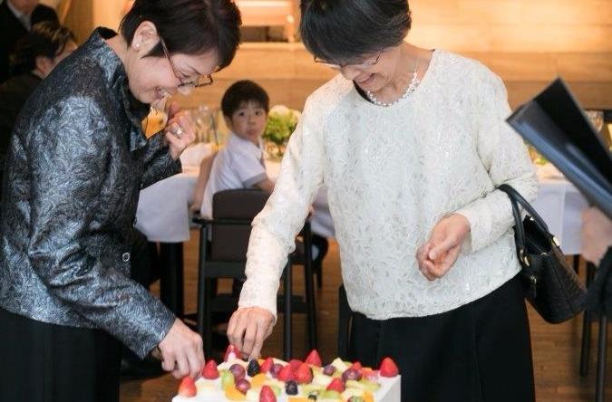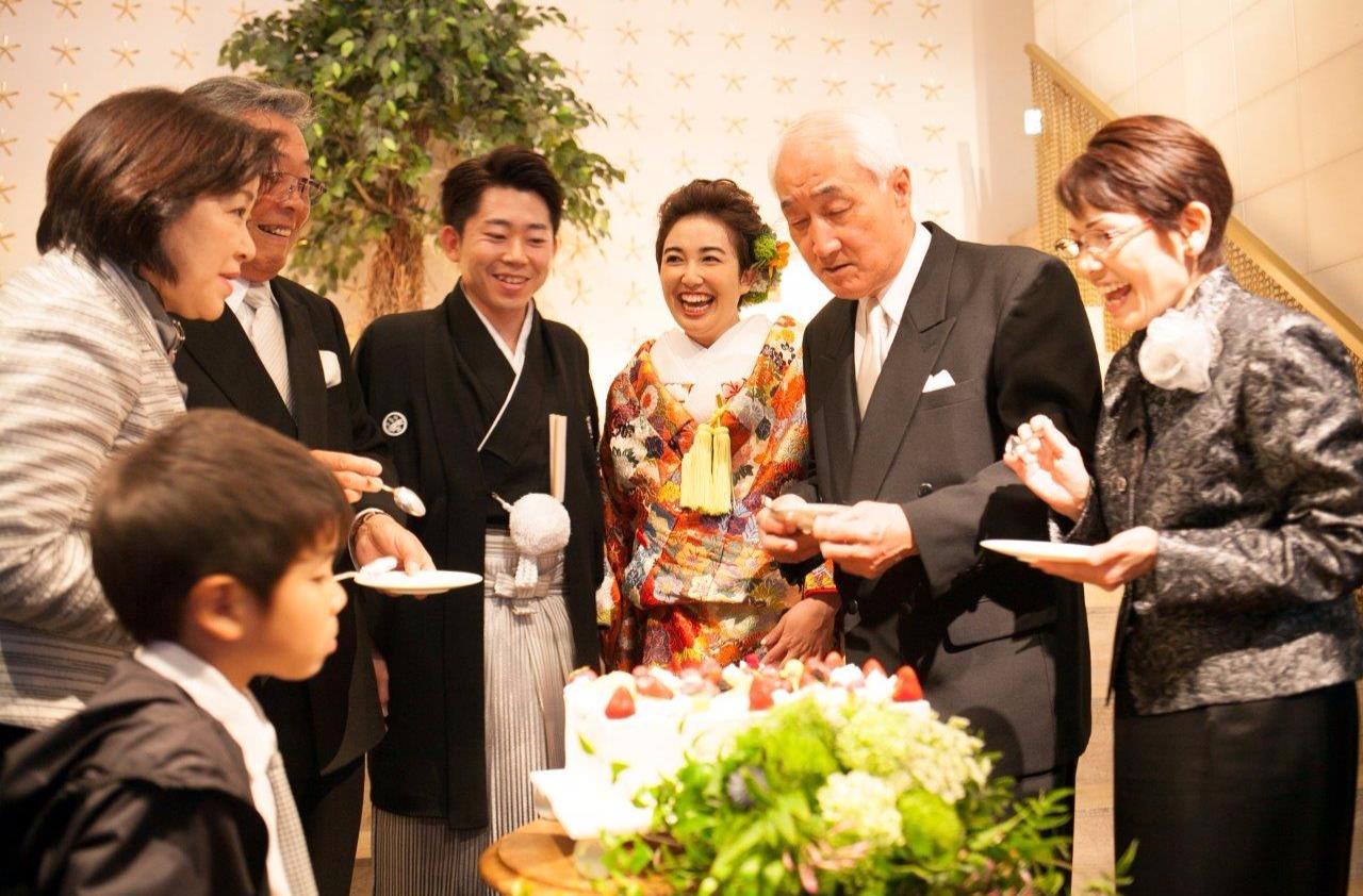 一軒家の会場へご案内し、新郎新婦入場までの時間に、おふたりのウェディングケーキをご家族皆様で仕上げていただきました。 ケーキにフルーツをのせたり、チョコペンで文字を書いたり、お子様たちも楽しそうに両家がまじわった、あたたかい時間となりました。 お食事中には、ご家族全員の自己紹介を。思い出話や、はなむけの言葉を交えお話いただき、おふたりもとてもお喜びでした。
