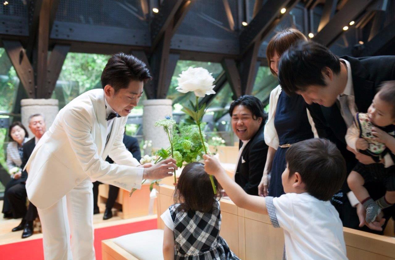 全員参加型の人前式にしたい!と、ブーケセレモニーで皆様からお花を集めてたご新郎様の入場。 また、誓いの言葉を綴ったカードを箱にいれ鍵をし、お互いの鍵を交換して箱と一緒にご両家のお母様へお預けするというオリジナルのセレモニーをされました。箱を開けるには、両家の親御様とおふたりが揃わなければいけません。家族をつなぐという、おふたりの想いが形になったプログラムとなりました。