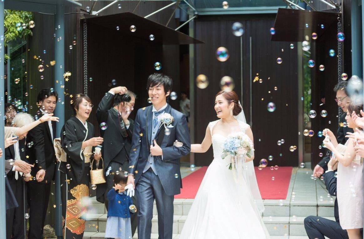 挙式では、ゲストとの一体感が感じられる人前式を。 結婚誓約書には、星型のつみきにゲストの名前を書いていただき、集めていくものをご用意されました。 たくさんの星が額に入った誓約書は新居に飾るにも素敵な思い出になると、人気の演出のひとつ。 挙式後にはシャボン玉でゲストにお祝いいただくバブルシャワーも。写真栄えする素敵なシーンとなりました。