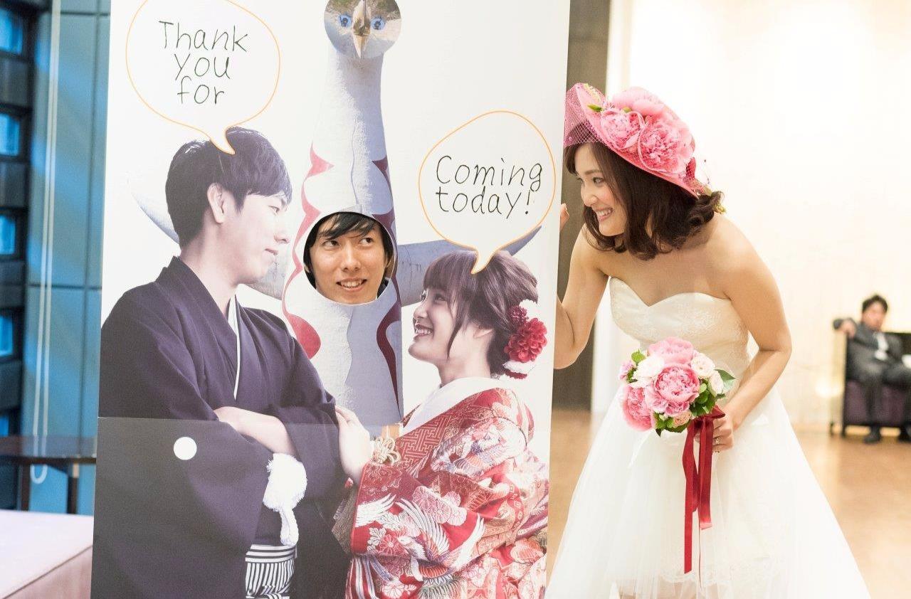 ウェルカムボードとしてご用意されたのは、太陽の塔の顔出しパネル。 デートなどで出向いた場所に顔出しパネルがあれば、必ずお写真をとるという新婦様。 ご自身で引き伸ばしたお写真パネルをくりぬいて手作り顔出しパネルを作るというDIYも! また、こだわりのパーティをシネマエンドロールとして、披露宴の締めくくりに大スクリーンを使ってご覧頂きました。 おふたりもゲストも大満足のパーティとなりました。