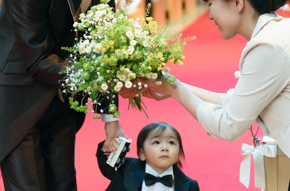 ご新郎様と一緒に入場したはるくん。ゲストの方からお花を受け取り一緒にブーケセレモニーを。