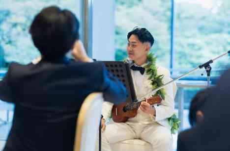 披露宴のスタートはまさかの親御様とのコラボレーション!フラダンスを習っていらっしゃる新婦様のお母様と弦楽器が弾ける新郎様。 新郎様のウクレレの演奏と歌で、留袖姿の新婦お母さまによるフラダンスショー♪ 見守っている新婦様も「レイ」を付けて、思わずゲストも笑顔になるひとときとなりました。 おふたりにとっても、親御様にとっても、記憶に残るシーンでした。