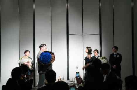 ご新婦様を輝かせる一日にしたい! 当初から、そうお話下さったご新郎様。おいそがしい合間を縫って、水面下で進めたご新婦様へのサプライズは 皆様へのご挨拶のあと、おふたりの大切な方々が見守って下さっている結びのお時間にとご提案。 そして、『神聖』や『神の祝福』という花言葉を持つ 青い薔薇。『100%の愛』を込めて100本の花束をご準備しました。