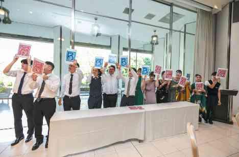 披露宴入場もおふたりが登場後凛久くんが男性ゲストと一緒に入場するという演出を行いました。披露宴の余興といたしまして、格付けチェックを行いました。本格的に準備を進めてこられたおふたりの思いが届き、ゲスト参加型で会場全体が大いに盛り上がり、おふたりとゲストの笑顔があふれるシーンになりました。この演出にはスタッフも大盛り上がり!