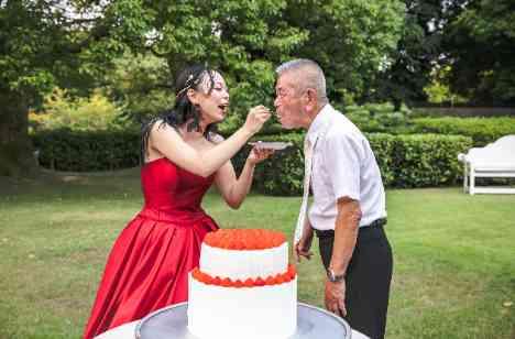 ウェディングケーキ入刀後、サンクスバイトをおじい様とおばあ様に行いました。悠寿花さんからの感謝の『想い』をと。サプライズでお呼びしたので、おじい様もおばあ様もとても驚いておられましたが、サンクスバイトを受け取ったおじい様とあばあ様の幸せ溢れるお顔を見ることができた広大なガーデンでの演出は、スタッフ含め会場全体が幸せと感動の時間となりとても記憶に残るシーンになりました。