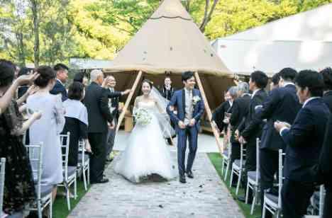 会場への想いを強くお持ちいただく中で、ガーデン挙式を選らばれたおふたり。 開放的な空間で皆様の印象に残る挙式にされました。 会場を象徴する大きなティピテントをバックにフォトジェニックな空間での挙式に、フラワーシャワーではなく、リーフシャワーでの演出はとっても映えていました。