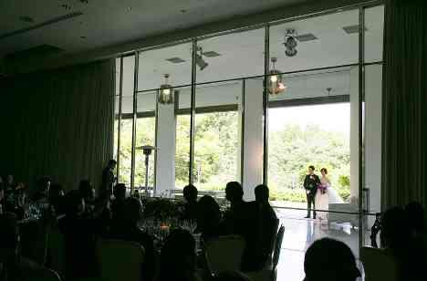 お二人がお選びいただいた季節は本当に緑がきれいな季節で、ご入場の際はカーテンがオープンし会場内に木漏れ日が差し込む中、壮大な緑をバックにお二人のご入場。 その後はお二人こだわりのお料理と最高のサービスをゆったりと楽しんでいただけるお時間になりました。