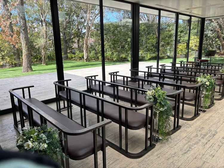 披露宴会場や挙式会場の近くには大きな庭や池も存在し、自然を感じることができる 雨天時の対応には心配がある