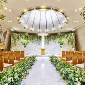花をモチーフにした天窓から柔らかな光が降り注ぎ、祭壇にたたずむ花嫁を美しく照らす独立型チャペル。 ゲストとの距離が近いのも特徴で、誓いの瞬間を温かなまなざしと拍手が包みこみます。