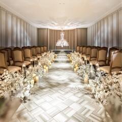 【聖なる祈りの宝石箱】外の世界から遮断された、空間・時間の概念さえない宝石箱。光が灯る歩みの先で、バカラ社製シャンデリアが神聖な輝きを放ちます。大切な人たちと心繋がる挙式体験を