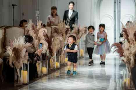 おふたりの元へ指輪を届けてくれたのは、リングガールちゃんとボーイくん。せっかく沢山お子様がいるから何かお手伝いをしてもらおう!と、お役目を依頼されました。ゆっくりと丁寧にリングピローを運ぶ前を、とびきりの笑顔で駆け抜けていくボーイくん。実は当日急遽の飛び入り参加で先導をしてくれました♪思わずゲスト様も笑い声を溢しながら、「頑張れ!」と温かな笑顔で見守ってくださいました。