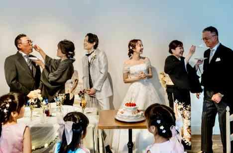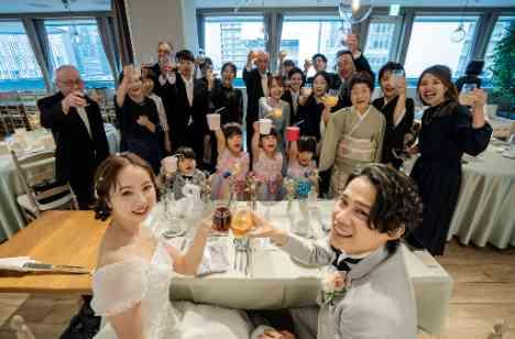 乾杯のご発声では、挙式でも大役を担った3名のお子様が再登場♡ 突然音楽が鳴り、ダンスを披露してくれたお子様たち。 実はダンスは新郎新婦へのサプライズ演出!!! そんな可愛らしいゲスト様からおふたりへのサプライズに、 みなさまは、驚きながらも喜びの表情を見せてくださいました。 乾杯直後の皆様での集合写真は、少人数ウェディングならではのワンシーンとなりました♪