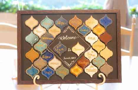 おふたりのお写真やこだわり詰まった小物を飾ったウェルカムスペース。皆様には待合時間から楽しんでいただきたいという想いから、ゲストと一緒につくり上げるウェルカムボードをご用意されました。 ゲスト一人一人がタイルにお名前を書き、思い思いの箇所に貼ることで完成したタイルボード。パーティが始まる前に会場へと移動し、皆様にも完成版をご覧いただくことができました。