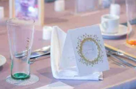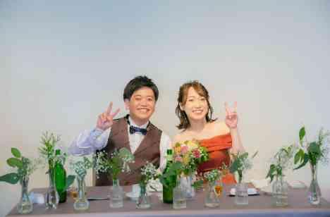 “Oiwai glass”と呼ばれるこのグラスは、ゲスト様の名前のイメージで1つ1つ色付けが施されたもの。 おふたりこだわりのアイテムたちが、華やかにテーブルの上を彩ってくれます。その下に敷いた当たり付コースターを使用した抽選会では、皆様ドキドキの中一斉にコースターを裏返し当たりの発表へ。「当たった!!」と嬉しそうなお声が聞こえ、とびきりの笑顔を見せてくださいました。