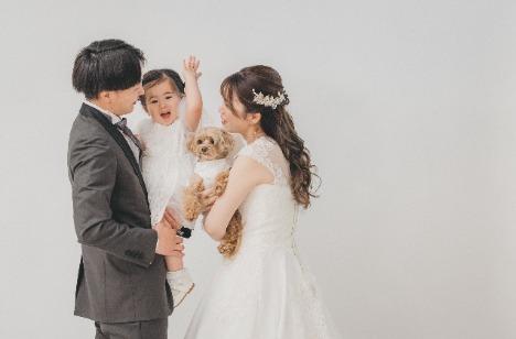 結婚式に先がけて行われた前撮りでは、 リラックスしたおふたりとお子様の表情を撮影。 自然体で過ごされる時間の中で、無邪気に笑うお子様の様子や、傍に座るわんちゃんの姿を、しっかりと大切に写真へおさめさせていただきました。 前撮りで紡がれた時間があったからこそ、 当日の一瞬一瞬が、より深くより特別なものに__。 ご家族様で迎える結婚式へのカウントダウンが始まりました。