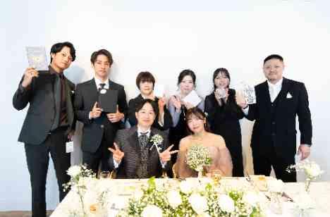 新郎様がくじ引きで、最初のゲストを決定! 「一番オシャレだと思う女性は?」「一番お酒が強そうな男性」「今日一番笑顔が素敵な女性」「バレンタインで一番チョコをもらっていそうな男性」「新郎新婦へ一言いいたくてうずうずしていそうな人」。会場を見渡し、お題に沿って「この方だ」と思うゲストへボックスが手渡されます。参加型の演出にわいわいと盛り上がり、お手伝いいただいた皆様で結びには集合写真も!