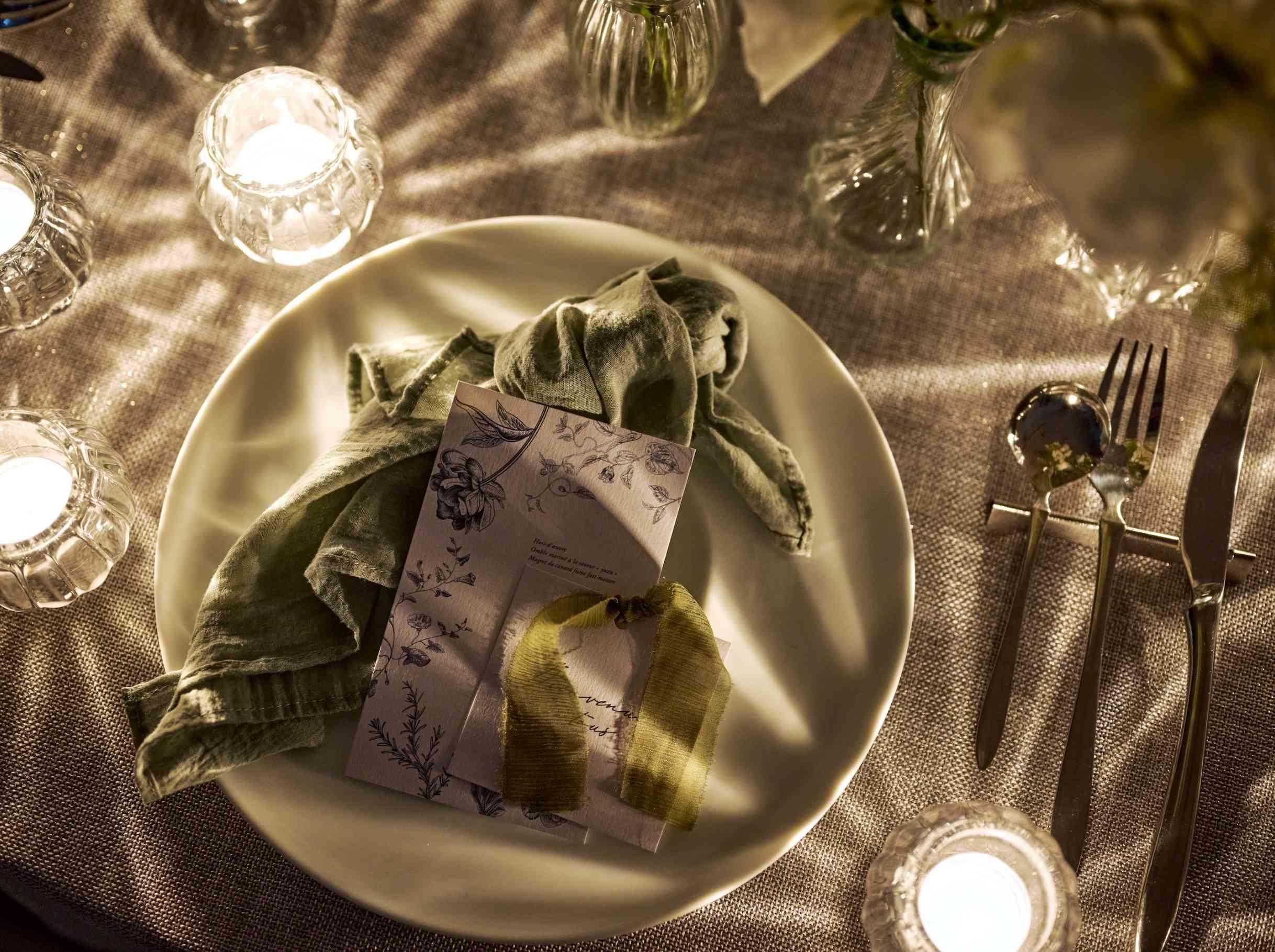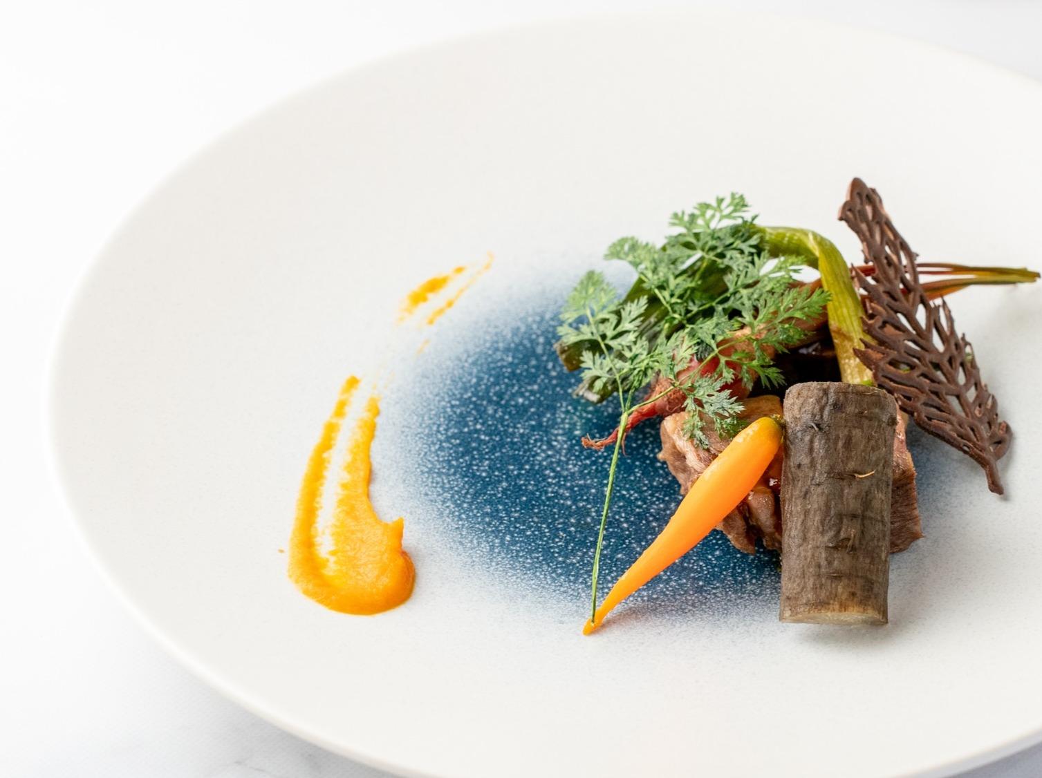 チャペル・ド・コフレでは、フレンチをベースとしたフルコースをご案内。『Coffret=小箱』をイメージしたガラスの小皿でお届けする最初のひと皿は、「大切なものをそっと詰める」想いを込めたおもてなしです