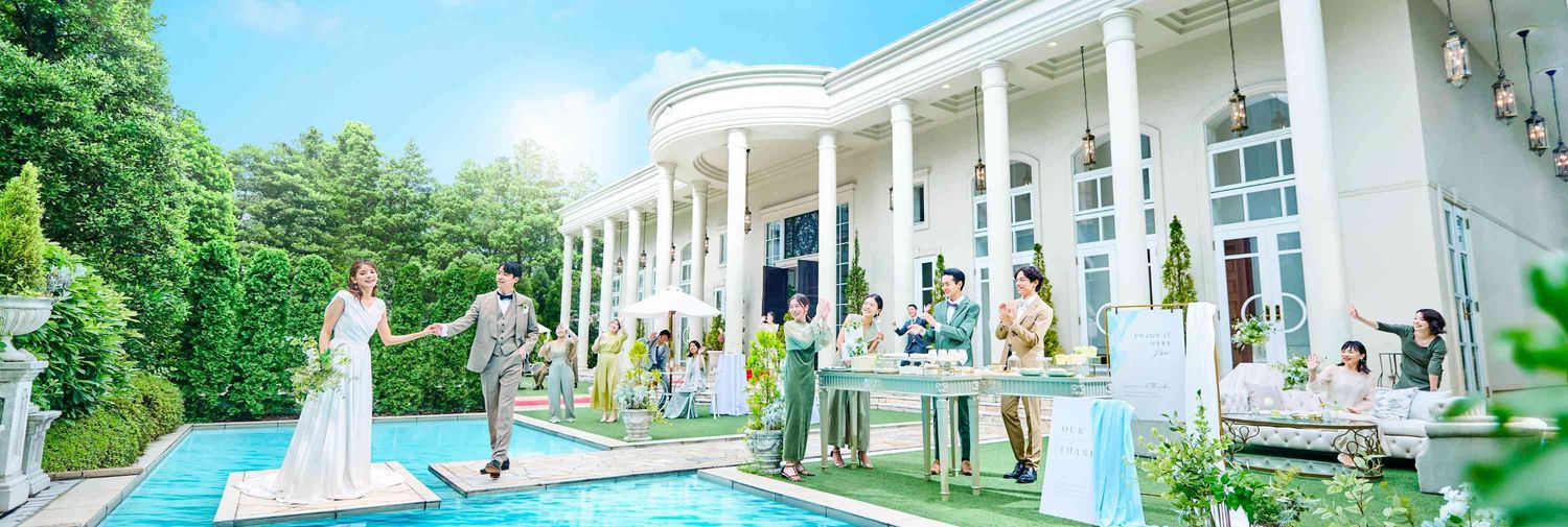 【仙台駅から徒歩5分】緑に囲まれた「駅のすぐそばにあるとは思えない」まるで海外リゾートのようなプール付きガーデンが美しい⽩亜の邸 宅。好アクセス好⽴地だからこそ、ゲストも式の前後で仙台の街並みを満喫