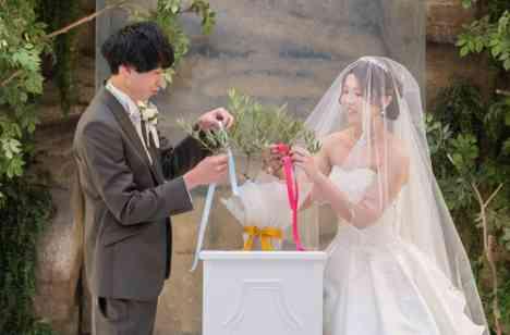 ご新郎様のお名前の「大地」とご新婦様のお名前の「美咲」にちなんでの演出を考えました。「大地に美しく咲く」ようにオリーブ木にリボンを付けました。植樹ではなくFESっぽくリボンを付ける演出としました。お二人だけではなく証人となるご友人様にもリボンをつけて頂き、今後もご自宅で飾ることのできるアイテムとなりました。