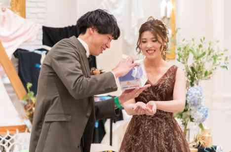 お色直し入場の際の曲当て投票を行いました。当日会場内全てお二人のお好きな曲でご用意いたしました。正解した方の中から抽選でお二人からプレゼントのお渡しをしました。お二人と同じく、音楽が好きなゲストの方が多く、正解した方も、間違った方も皆さまが楽しく盛り上がっているのが印象的です。お二人もノリノリで入場をしていました。
