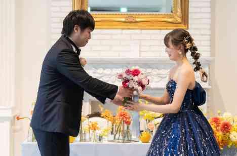 お色直し入場後に、ご新郎様からご新婦様へサプライズを行われました。お色直し後にお持ちになりたいとお話しをされていたカラードレス用のブーケをプレゼントされました。そのあとの進行はプレゼントされたブーケを持って、ゲストの皆様とお話をされたり、お写真を取られたりと楽しく、にこやかなお時間を過ごされました。