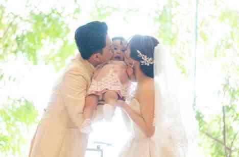 家族への感謝とともにおふたりのお子様お披露目の機会とも考えていらっしゃたのでリングガールとしてお子様と大切な両家の妹様にお手伝いをしてもらい、ゲストに初お披露目。あまりのかわいらしさに歓声があがるほどでした。 ウェディングキス、証明書のサインもお子様にお手伝い頂いたことによって、お披露目だけでなくゲストも心あたたまるあたたかい挙式になりました。