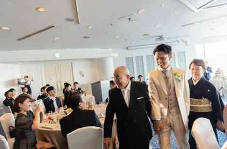 みなとみらい1-1-1という場所だからこそ見ることができる何にもさえぎられることなく水平線まで続いていく海。 カーテンが開いた瞬間、歓声が会場に響き渡り、海と太陽の光に包まれるおふたりの姿がとても素敵でした。 そんな会場で一番盛り上がったのは両家のおじいちゃんおばあちゃんとの中座シーン。特に親御様は嬉しそうに見守られ、心あたたまる時間になりました。