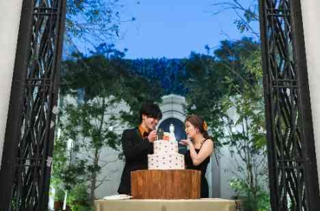 ガーデンセレモニー時とは時間帯も変わりナイトウェディングになったガーデンをバックにケーキセレモニー! ゲストみんなが集まり囲まれながらおふたりのこだわったハートがたくさん詰まったウェディングケーキセレモニーをおこないました! おふたりの再入場を今か今かと待ちに待っていたゲストたち。そんなおふたりの元には友人たちが、そばに来てくれました。