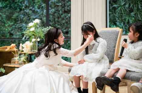新婦様のことが大好きな姪っ子ちゃんたちから、歌のサプライズをしていただきました。緊張しながらも一生懸命歌ってくれている姿にご新婦様はうれし涙を流し、その姿を見て、姪っ子ちゃんも涙を流していました。自然と新婦様が姪っ子ちゃんの近くに行き、涙を拭いてくれ、またゲストの皆様も自然と手拍子をしてくれたりと温かいお時間になりました!