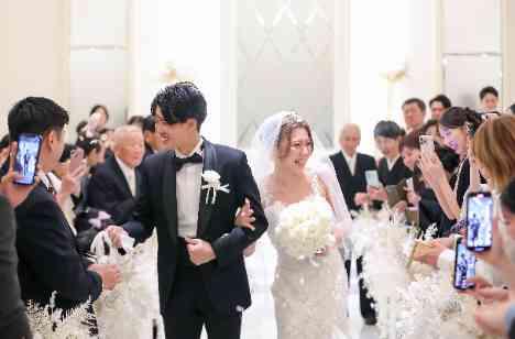 ホワイトハウスの挙式会場は扉が開いた瞬間に光が差し込んでパッと明るい白になります。扉が開く瞬間は、ご新婦様の生まれた瞬間を表していて、入場シーンはキラキラ輝いてとても綺麗に見えます。当日はご新婦様が入場されてから、お父様とおばあ様にはバージンロードを通ってご新婦様の元にお迎えに進んでいただきました。