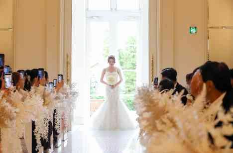 ホワイトハウスの挙式会場は扉が開いた瞬間に光が差し込んでパッと明るい白になります。扉が開く瞬間は、ご新婦様の生まれた瞬間を表していて、入場シーンはキラキラ輝いてとても綺麗に見えます。当日はご新婦様が入場されてから、お父様とおばあ様にはバージンロードを通ってご新婦様の元にお迎えに進んでいただきました。