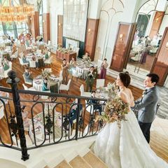 【選べる2つの全館貸切邸宅】 大階段から見渡す披露宴会場・緑溢れるガーデンへと続くロケーションは絶景◆会場とガーデンが一体型で天井高6m&自然光差し込む開放空間◆フロアの移動もなくバリアフリーで安心♪