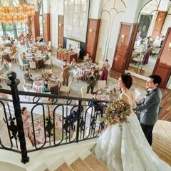 【選べる2つの全館貸切邸宅】 大階段から見渡す披露宴会場・緑溢れるガーデンへと続くロケーションは絶景/ガーデンとバンケットが一体型で天井高6mの自然光差し込む開放的な空間◆全館貸切&バリアフリーで安心